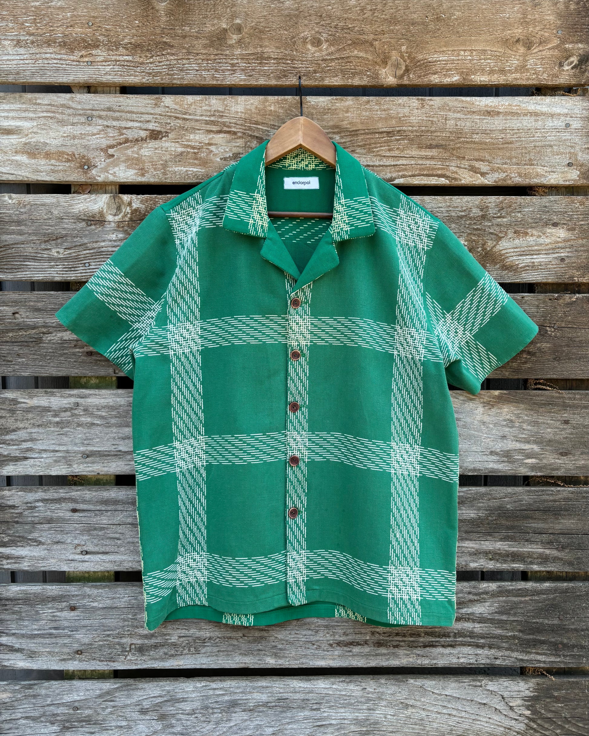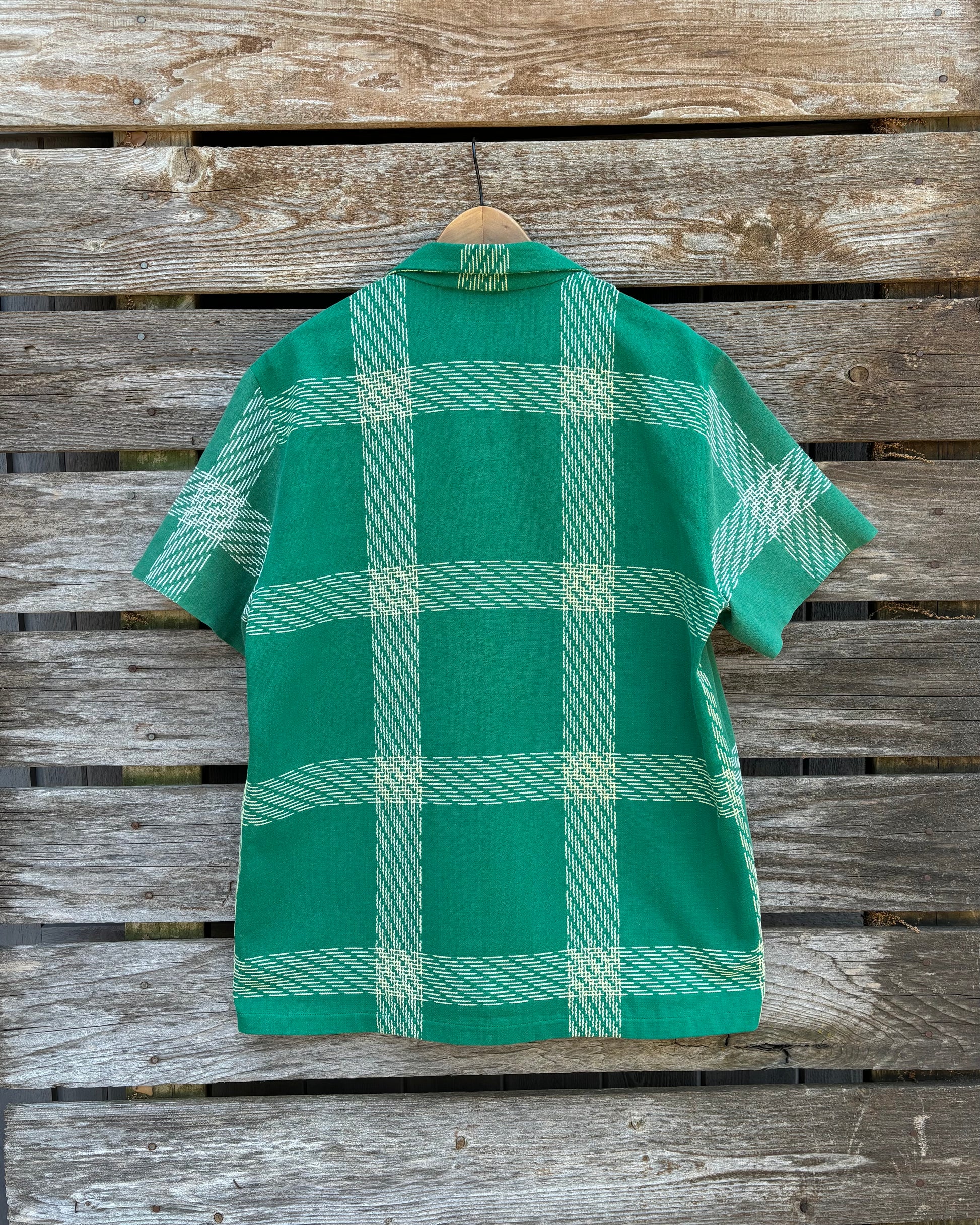 This shirt is made from two 1960s cotton tablecloths in a pastoral green print, reimagined for the body instead of the table. In mid-century America, Simtex revolutionized interior design by making bold, affordable printed textiles a staple of modern dining. Their tablecloths brought color and personality to everyday meals, reflecting a new era where form met function in the home. No longer just a backdrop, the table became a stage—set with pattern, texture, and intention. This shirt carries that same energy: domestic but daring, soft-spoken but vivid. Worn now, it’s a quiet rebellion—celebrating a time when design came home by making it move once again.