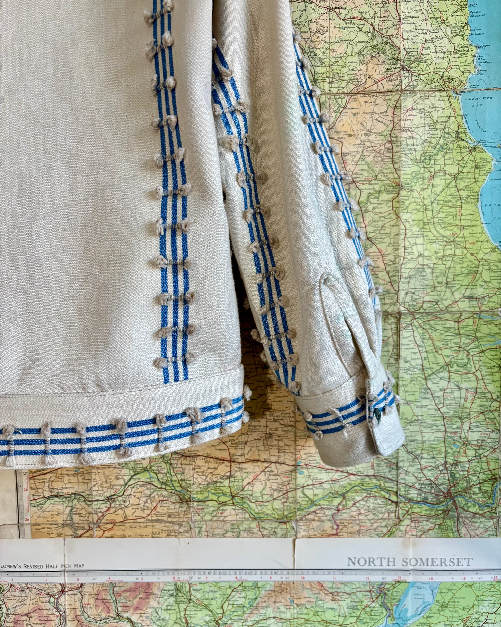 The jacket is adorned with buttons coming from a now-closed English haberdashery shop that operated from the 1950s-1980s.